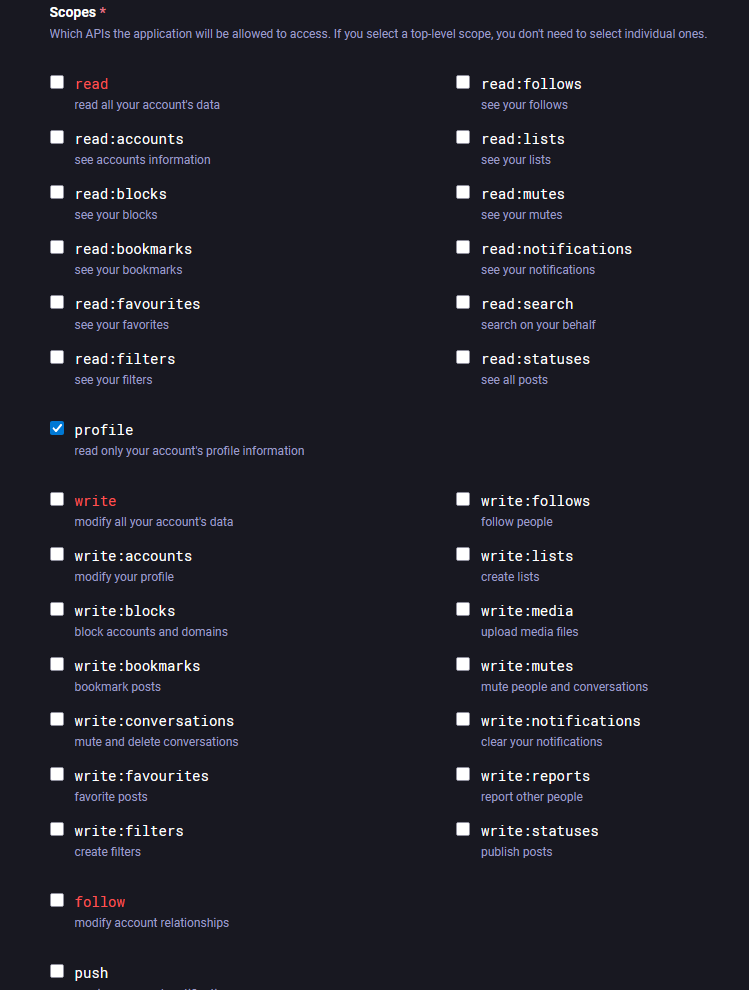 Some programs allow users to use access tokens to connect to a service. These tokens enable remote access or allow a second program to act on behalf of the user, without sharing the user’s actual credentials. They kind of function like visitors badges in the real world. All access tokens must be scoped, which generally entails a user selecting what permissions a token allows its bearer to have. Can a user with the token only read data in the program? Can they write data? Delete it?