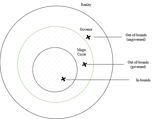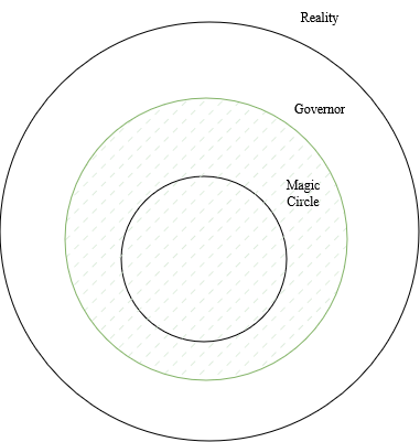 - Outside every magic circle we can imagine there’s a “governor” (defined as G) that uses rules to evaluate actors’ actions for compliance with domain-relevant or approved actions in C. Governors are my metaphor for the total combination of norms, rules, rule makers, and regulators that define and enforce the permissible action space in C.[1]1